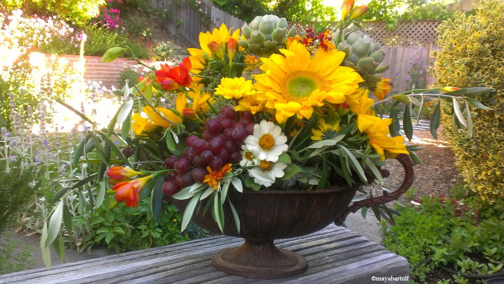 I am excited to share my adventures in gardening, floral design, and the beauty of the Northern California wine country with my new blog, Flowers and Grapes. My floral arrangement pictured above in a repurposed rustic urn, abundantly filled with seasonal homegrown flowers, vegetables and locally grown grapes is like a still-life reflecting my many interests in gardening, floral design, sustainability, and regional flavor. This abundant urn is also a metaphor for my hopes and dreams for continued bounty in my garden and in friendship, love, and life. Flowers and Grapes will be a platform to share my creativity, sense of whimsy, and celebrations of the seasons.